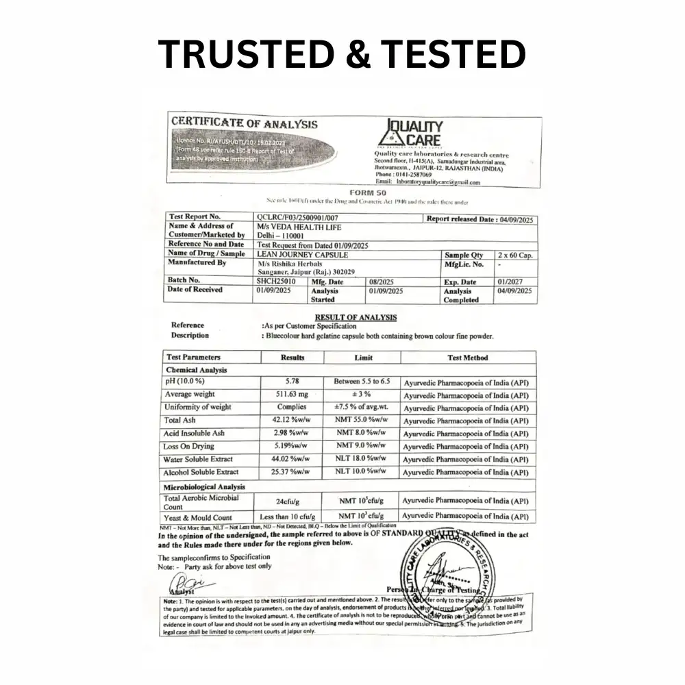 VHL Lean Journey Capsule is a 100% natural Ayurvedic weight loss formula for women, crafted with herbal ingredients to support healthy fat metabolism, appetite control, and energy balance – safe, effective, and chemical-free. 🌿