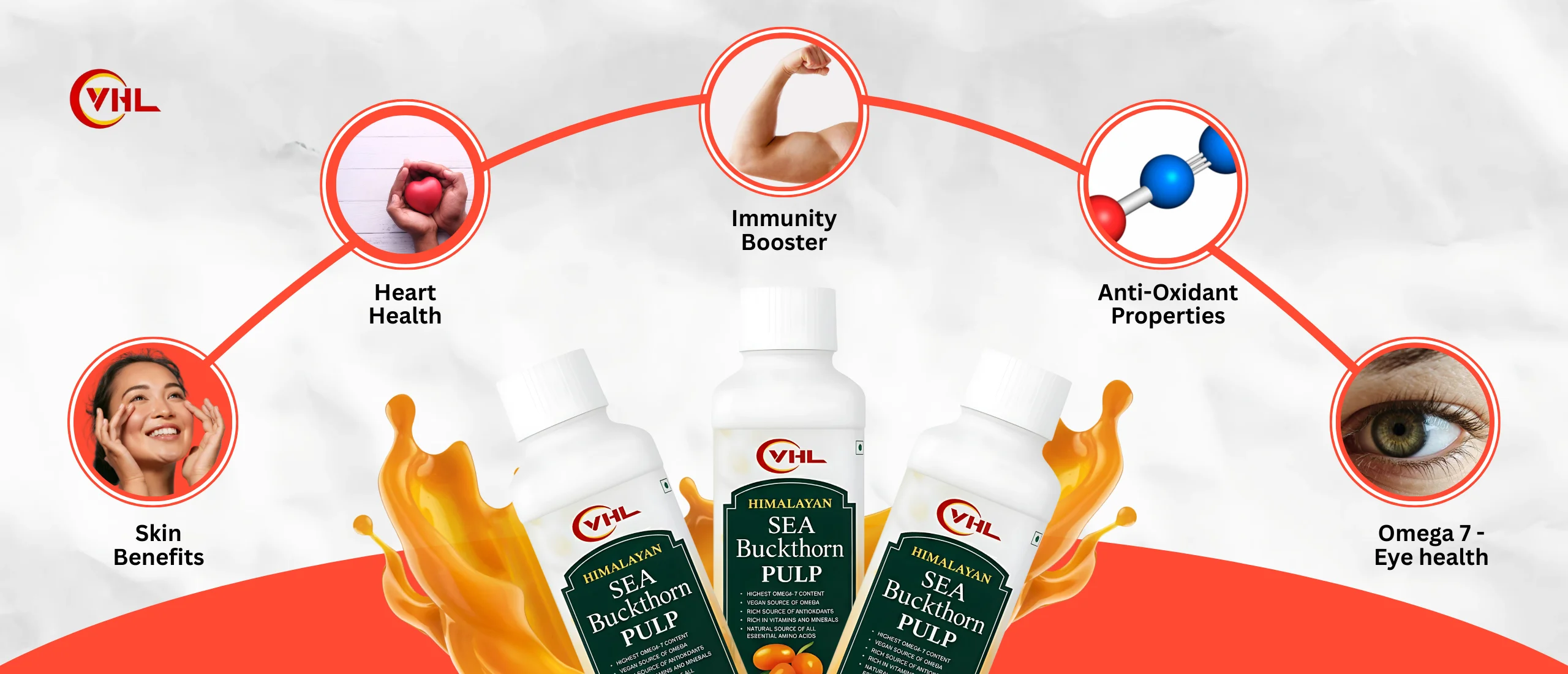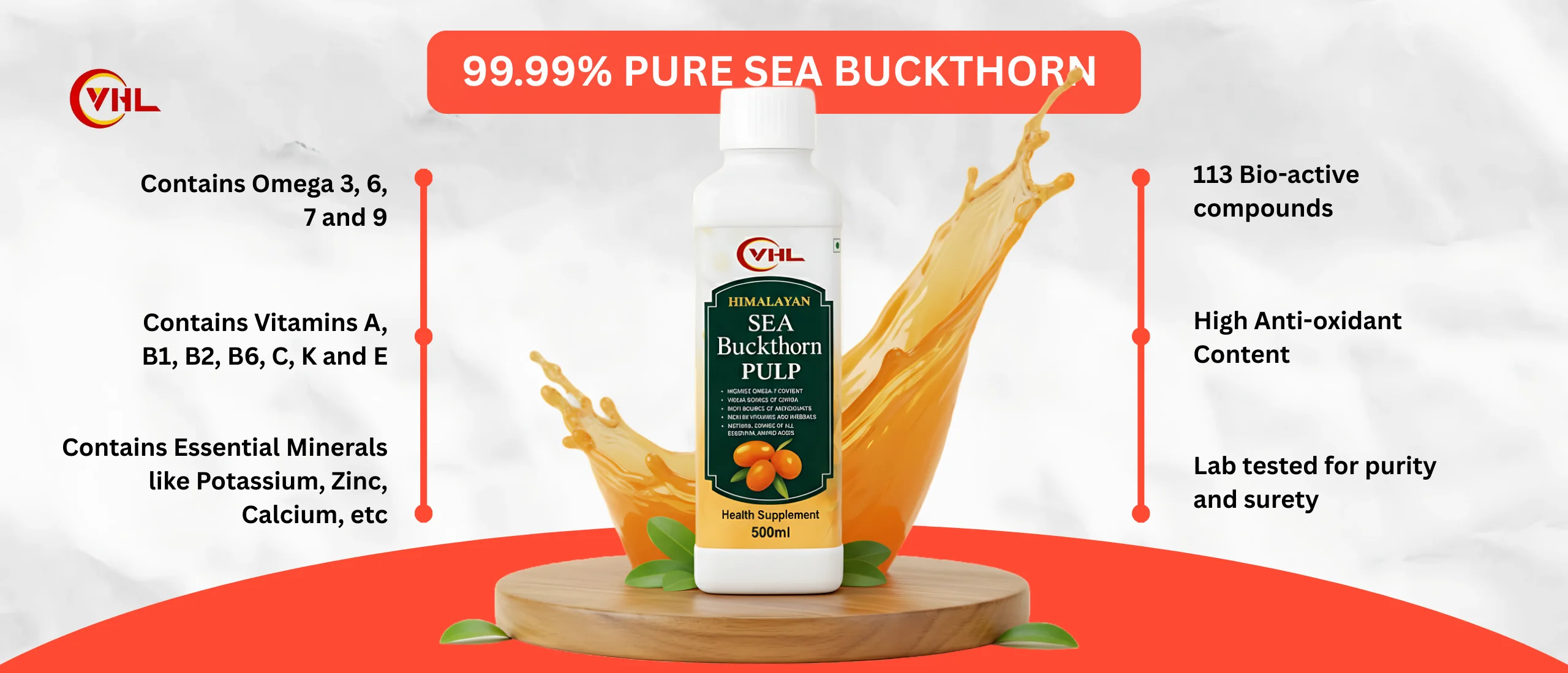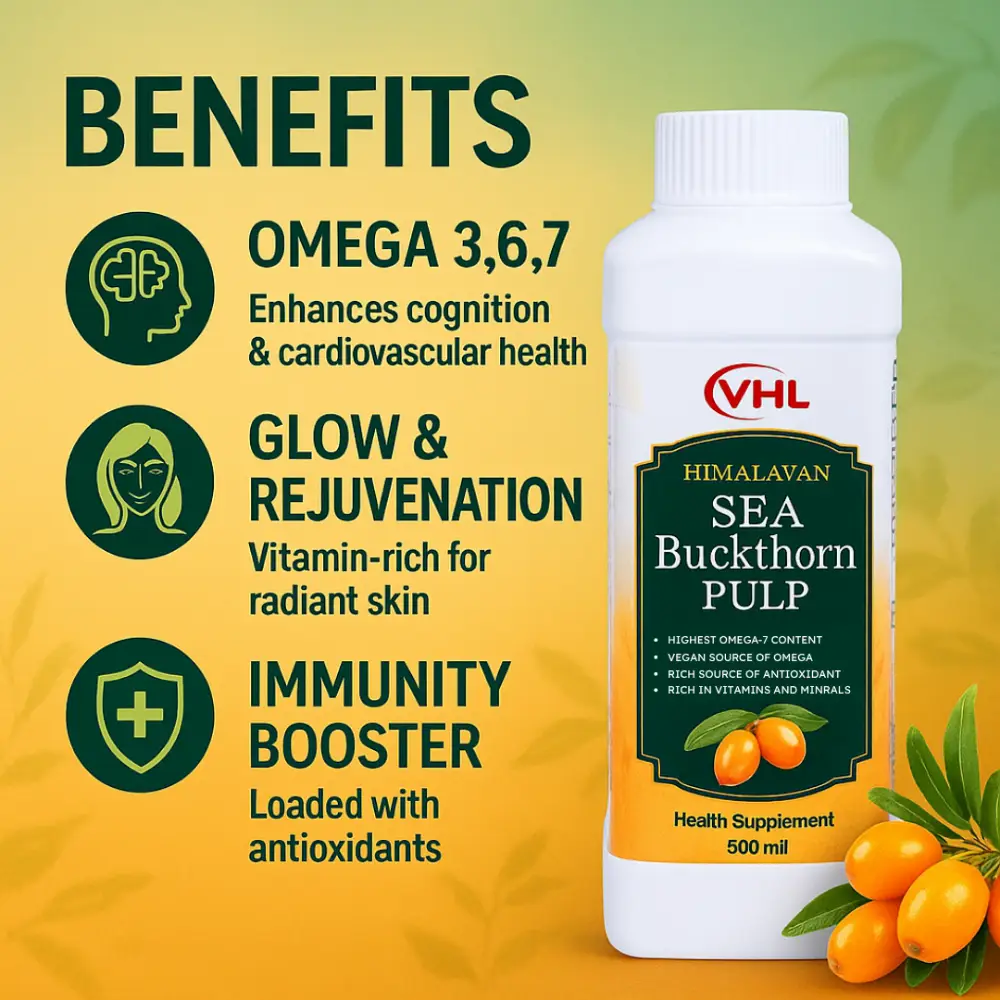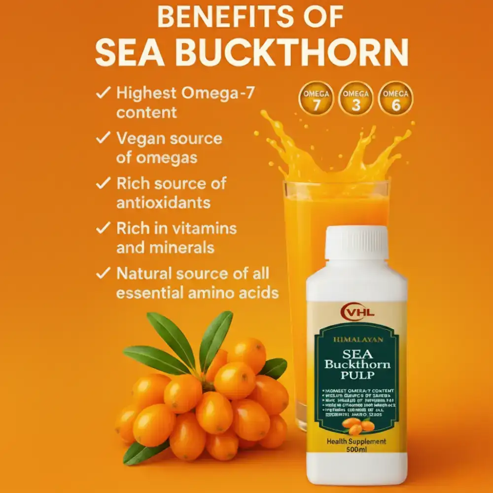 VHL Sea Buckthorn Pulp is a powerful natural health supplement, rich in Vitamin C, Omega 3, 6, 7 & 9, and antioxidants. It helps boost immunity, support digestion, improve skin health, and promote overall wellness – 100% pure & natural. 🌿